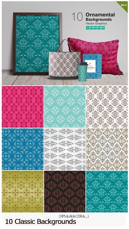 10 Classic Ornamental Backgrounds 10 vector backgrounds with classic decorative designs | 44.2 MB | EPS & AI & CDR & JPG format