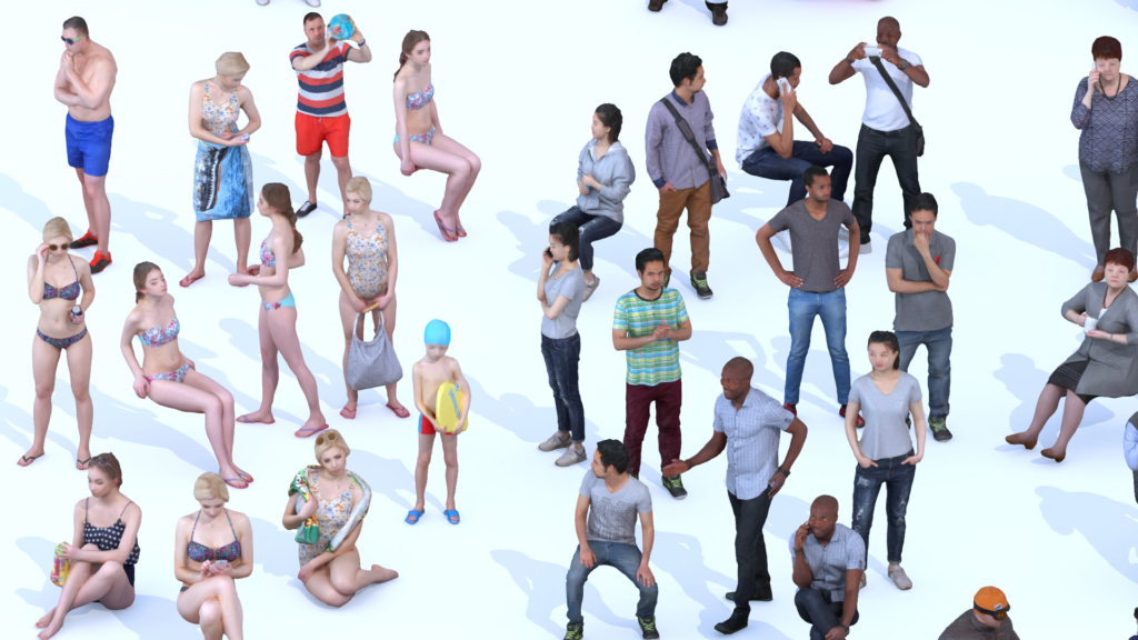 The product DOSCH 3D: Lo-Poly People Vol. 2 contains 100 fully textured lo-poly 3D-models (10,000 polygons per 3D-model) of photo-real people in various poses.