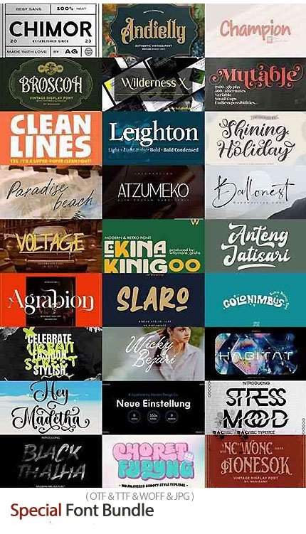 The Special Font Bundle is a collection of unique and amazing fonts. This bundle includes a variety of fonts that are made with special designs, styles, and details to allow users to make their texts and designs stand out using these exceptional fonts. The Special Font Bundle is a valuable resource for graphic designers, web designers, logo designers, and anyone looking for a unique and unique style for their projects. This bundle gives users the ability to choose a variety of fonts that suit any type of project and allows for creative and different designs. Each font in this bundle is designed with unique details and characteristics, including letter types, various styles, different sizes, and other options. This package allows users to carefully and artistically select fonts and use them to create amazing and attractive designs. Using the Special Font Bundle, you can easily find fonts that best match your project and content and use them to attract attention and create a strong visual impact in texts and designs. This package is a valuable tool that is recommended to anyone looking for exceptional and creative design. The fonts in this collection are available for download on the site in OTF, TTF, WOFF and JPG formats.