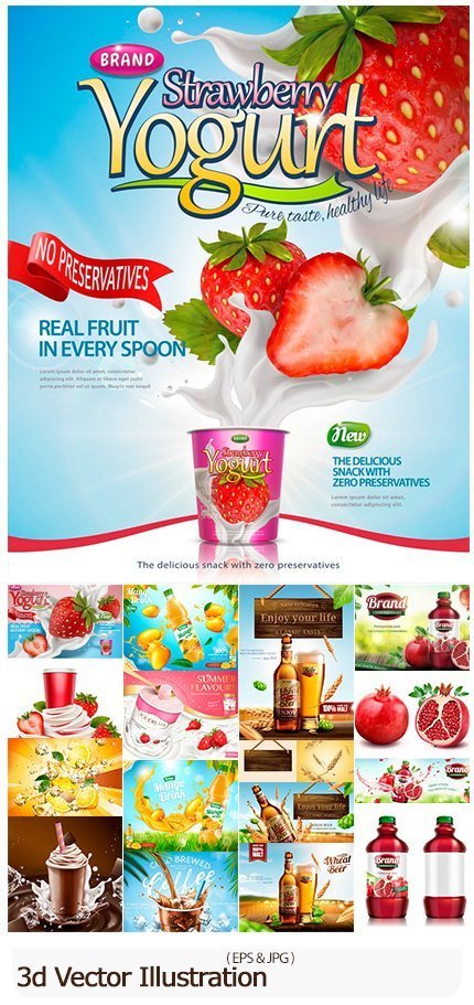 3d Vector Illustration With Fruits And Drinks 27 vector advertising posters with three-dimensional designs of juices and various fruits | 360 MB | With preview | EPS & JPG format