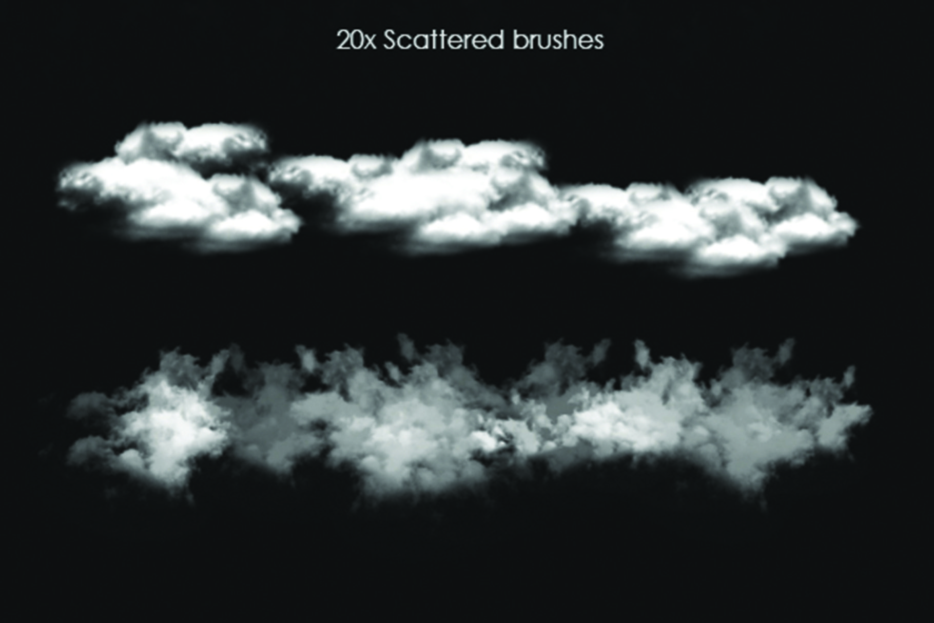 The set comes with 1x ABR files. The scattered clouds are pressure sensitive which means, if you have a graphics tablet, you will be able to choose the pressure you want to add to the clouds onto your project.