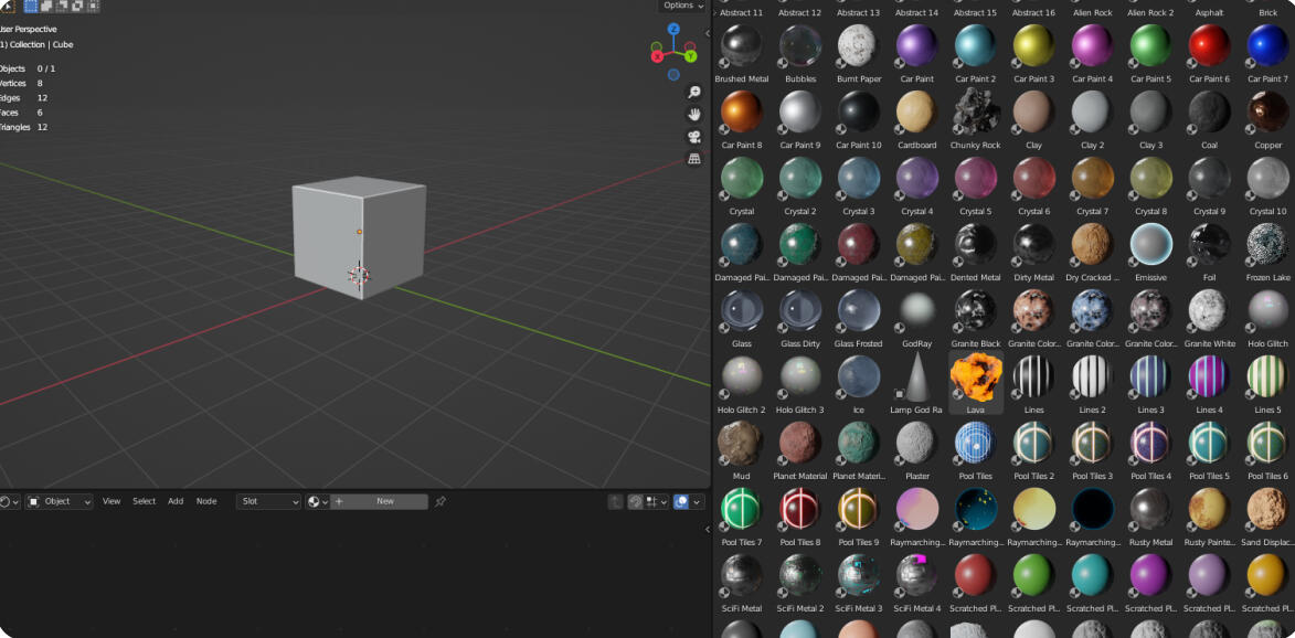 - In Blender, use File > Append to import individual materials, or open the included .blend files to browse the library