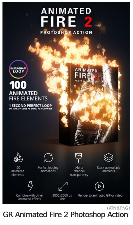 Use the built-in action to choose from 100 animated looping fire elements and include them in your Photoshop document, over your image. Render to animated GIF or video directly from Photoshop. Easily extend the 1 second initial video duration (looping) and upload looping cinemagraphs to Instagram. Fire elements can also be used in After Effects or Premiere.