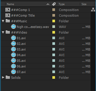 Choose comp size and frame rate, press on ‘Create Composition’, two comps and two folders will be created (one folder for music, one folder for videos). Import video files into the video folder and import 1 music file into the music folder.
