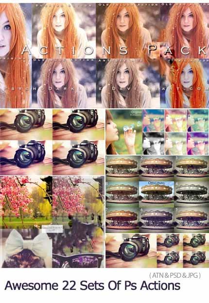 In this section, you can see the Photoshop Action Pack with 22 different effects that have been placed on the site for download in ATN, PSD, and JPG formats.