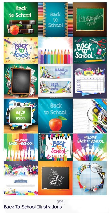 This collection includes amazing designs and elements of returning to school in vector format, which are available for download in EPS and JPG formats on the site.
