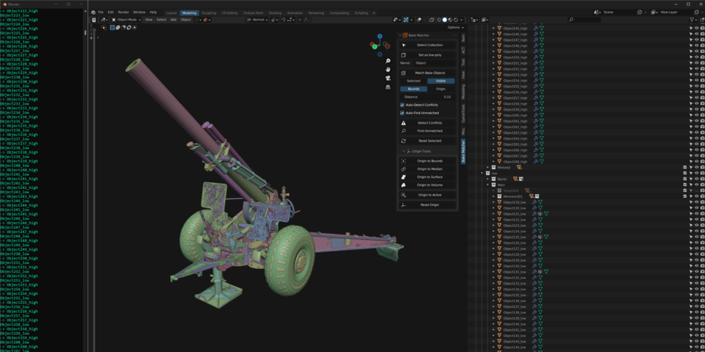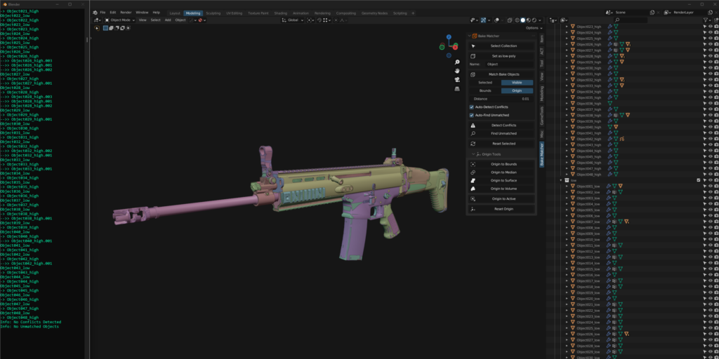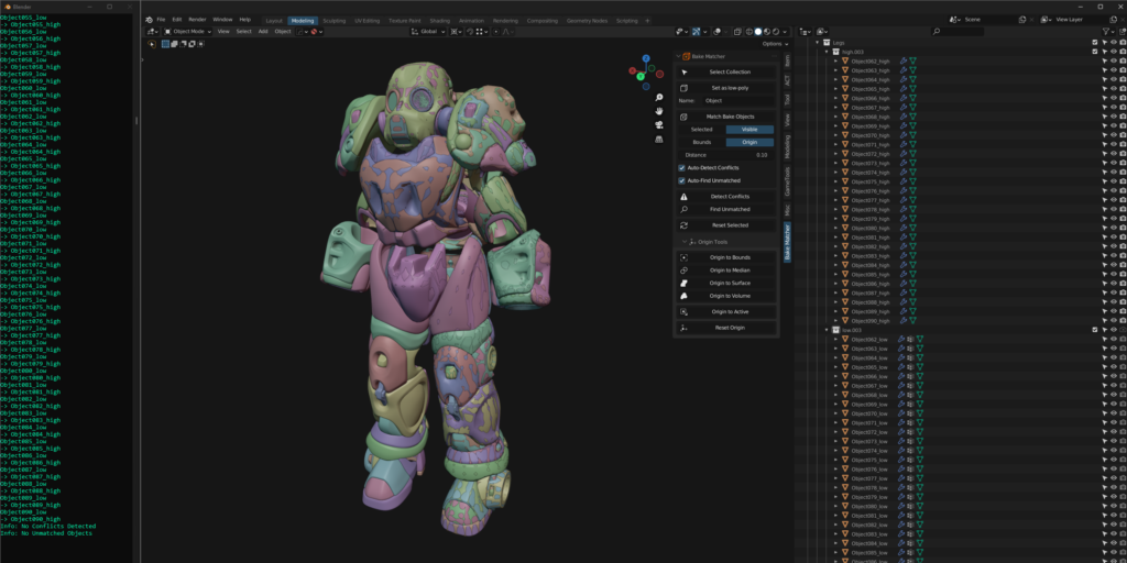 You can resolve conflicting low-poly or high-poly objects by adjusting the Distance value or by adjusting the origin point positions for Origin Mode. This tool is intended to be used before Match Bake Objects, as it will avoid overlap in the matching process.