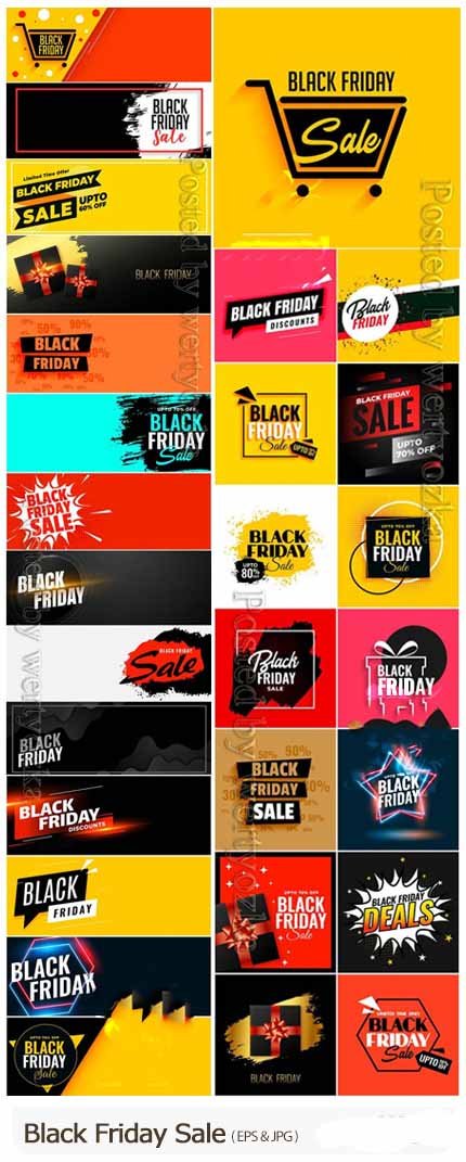 This section includes 29 Black Friday discount backgrounds and banners in vector format, which are available for download in EPS and JPG formats.