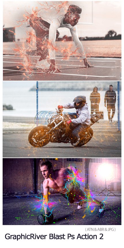Photoshop action creates the effect of colorful liquid particle explosion on images from River Graphics | 1.20 MB | With preview | ATN & ABR & JPG format