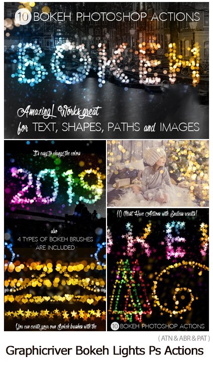 In this collection, you will see another example of Photoshop action called creating light bokeh effects on images from Graphic River, which is available for download in ATN, ABR and PAT formats.