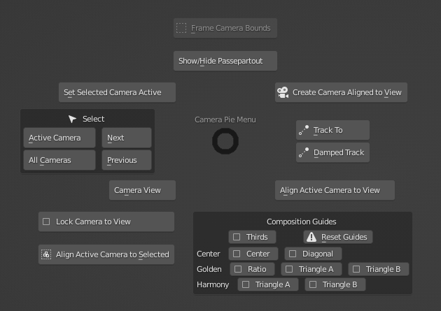 Access by pressing the assigned shortcut (default: ‘C’ or Right-Click in Camera View, customizable in preferences)