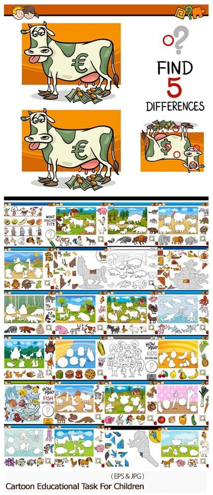 Cartoon Educational Task For Children 30 Vector Images Drawing Tutorials for Kids | 110 MB | Comes with preview | EPS & JPG format