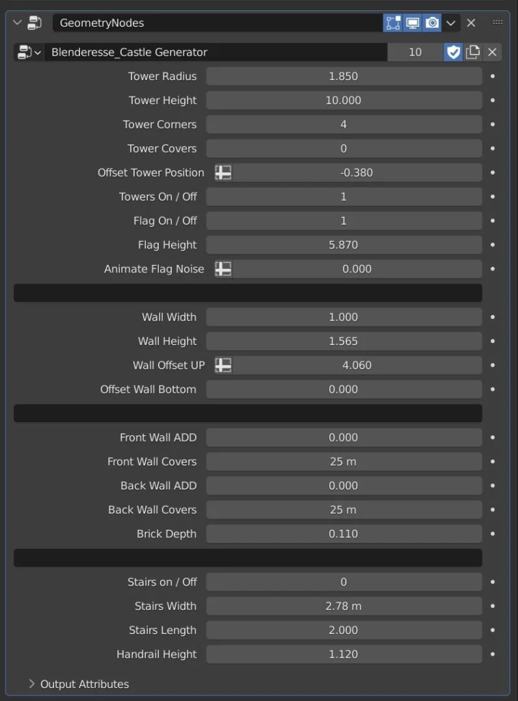 Access via the Add Menu > Geometry Nodes > Castle Generator or drag the node group into your Geometry Nodes editor