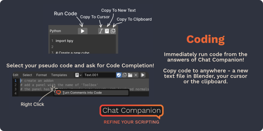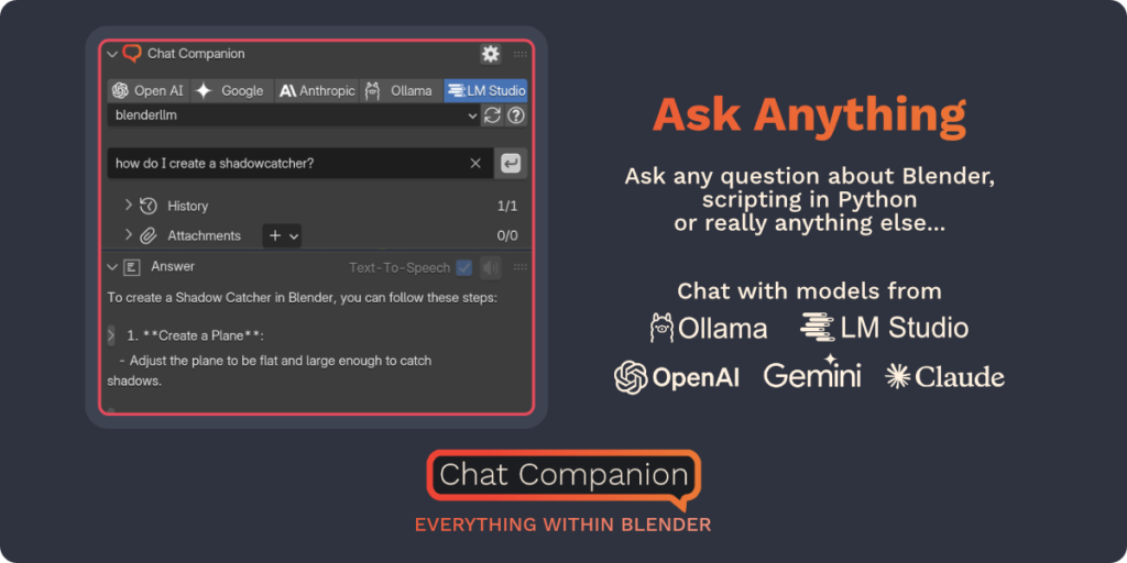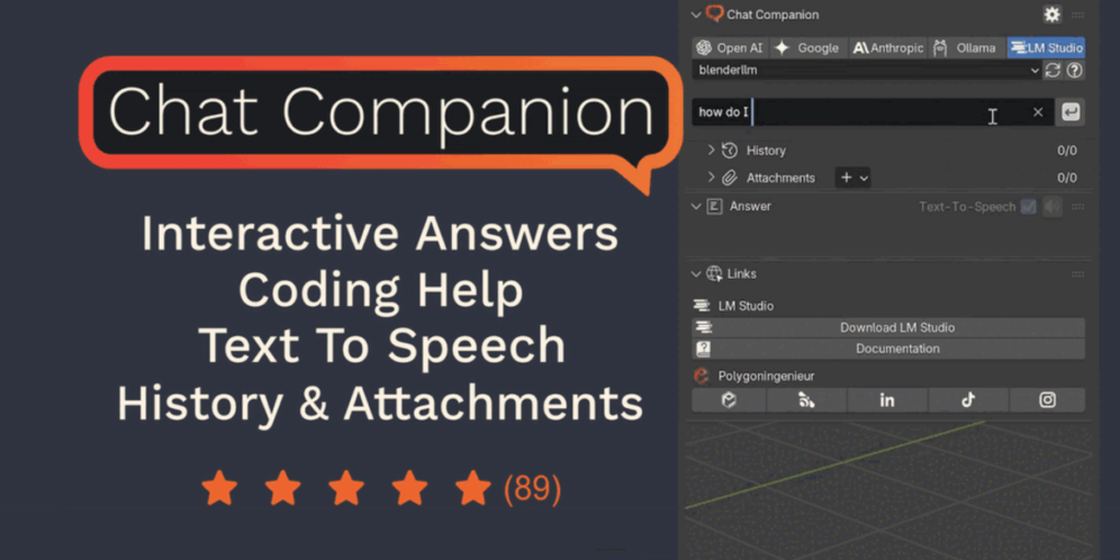 Download Chat Companion v1.5.2 for Blender on Windows and Mac, a revolutionary addon that integrates advanced Large Language Model (LLM) capabilities directly into your 3D viewport. With context-aware scene analysis, instant Python script generation, and intelligent troubleshooting, Chat Companion transforms how you solve problems and automate tasks, eliminating the need to switch between Blender, documentation, and external AI chatbots.