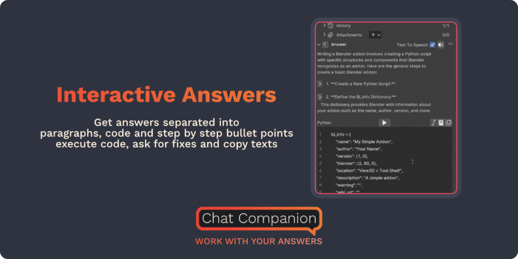 Get answers separated into paragraphs, code and lists – execute code, copy text and listen to the answers with text-to-speech.