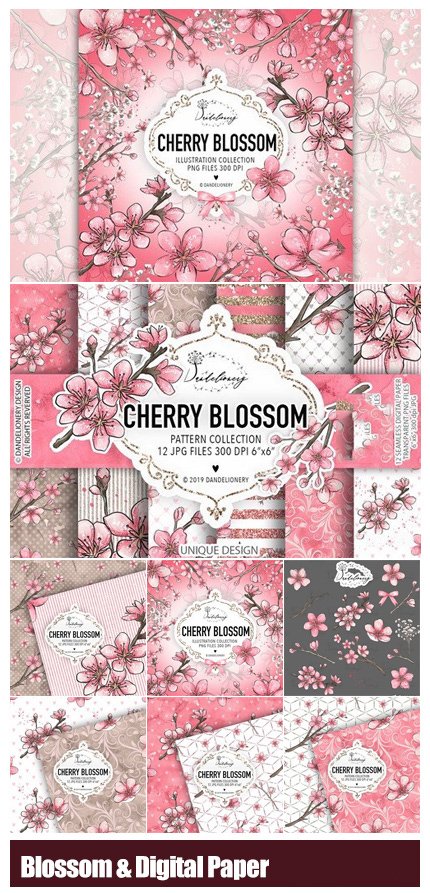 In this section, you can see clip art design elements of spring blossoms, including patterns, digital papers, flowers and plants, which are available for download in PNG and JPG formats on the site.