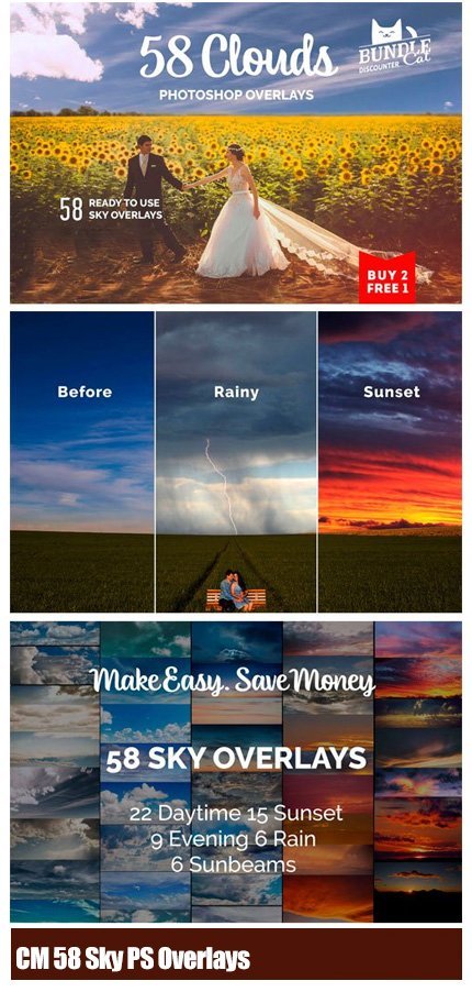 CM 58 Sky Photoshop Overlays Cloudy, sunny and rainy sky clip art for Photoshop 365 MB | With preview | PNG & JPG format