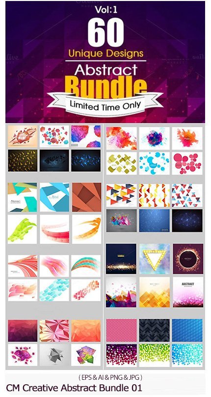 CM Creative Abstract Bundle Vol 01 60 background vector images with abstract and creative designs | 467 MB | Comes with preview | EPS & AI & PNG & JPG format