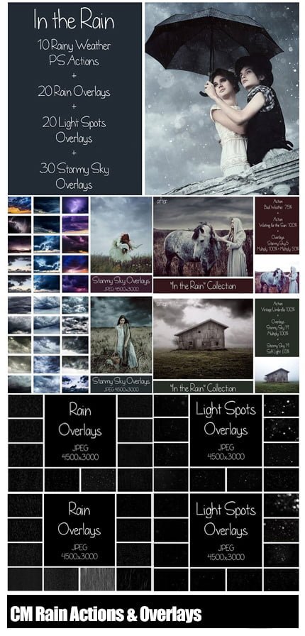 CM Rain Actions And Overlays Bundle Collection of Photoshop clip art and action images of rain effect, cloudy sky, bokeh and bright particles for images | 93.0 MB | With preview | ATN & JPG format