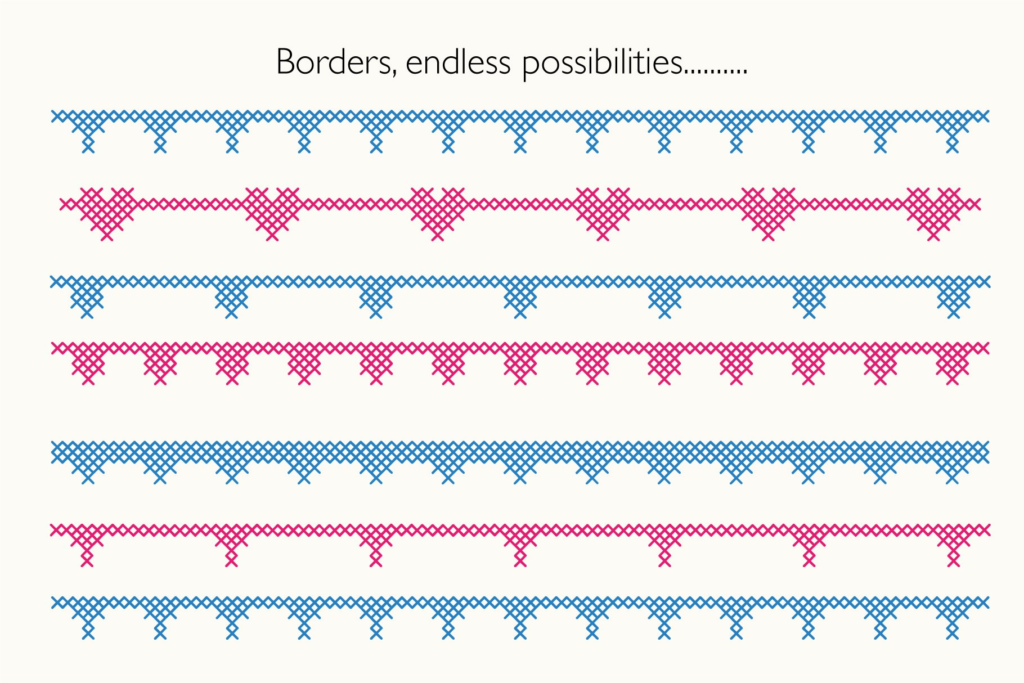 - Extensive decorative symbols and marginal elements (threads, needles, yarn, stitching)