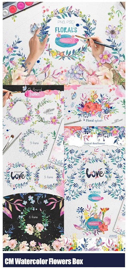 A large collection of hand-painted​ watercolor flower’s that can be put together to make beautiful and bright creations. This is clip art kit with more than 40 elements PNG, including florals, leaves, flowers, frames. Also, box included​ 11 layered PSD files and 2 background paper.