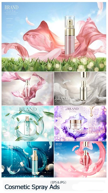 This section includes 7 3D advertising cosmetics designs in vector format, which are available for download in EPS and JPG formats.
