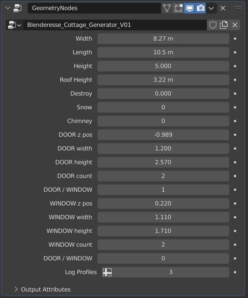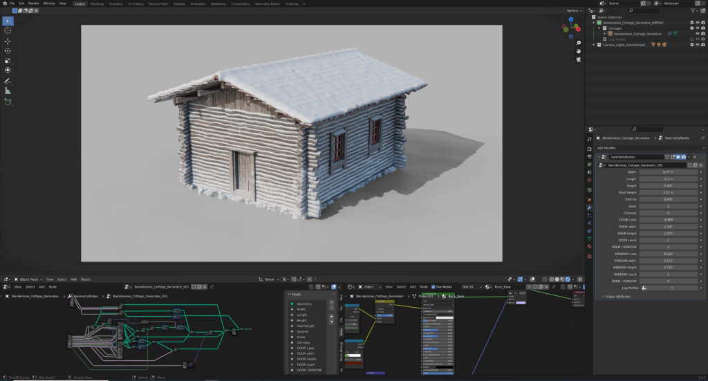 Access via the Add Menu > Mesh > Cottage Generator or drag the node group into your Geometry Nodes editor