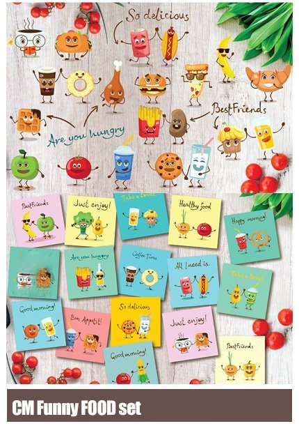 Funny FOOD set includes more than 40 cute tasty food characters plus more than 50 food cards with funny texts.