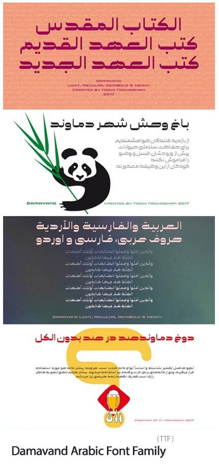 Damavand is designed by Naghi Naghashian. It is a Font family, in 5 weights, Light, Regular, DemiBold, Bold and Heavy. This font is a contribution to modernisation of Arabic typography, gives the font design of Arabic letters real typographic arrangement und provides more typographic flexibility. Damavand supports Arabic, Persian and Urdu.