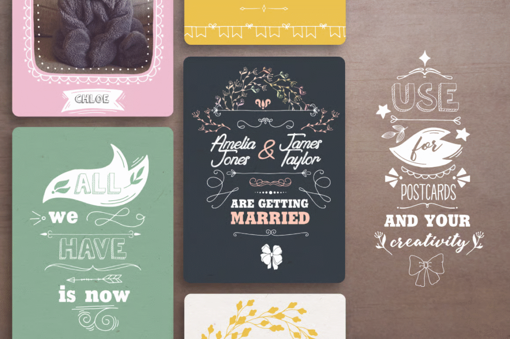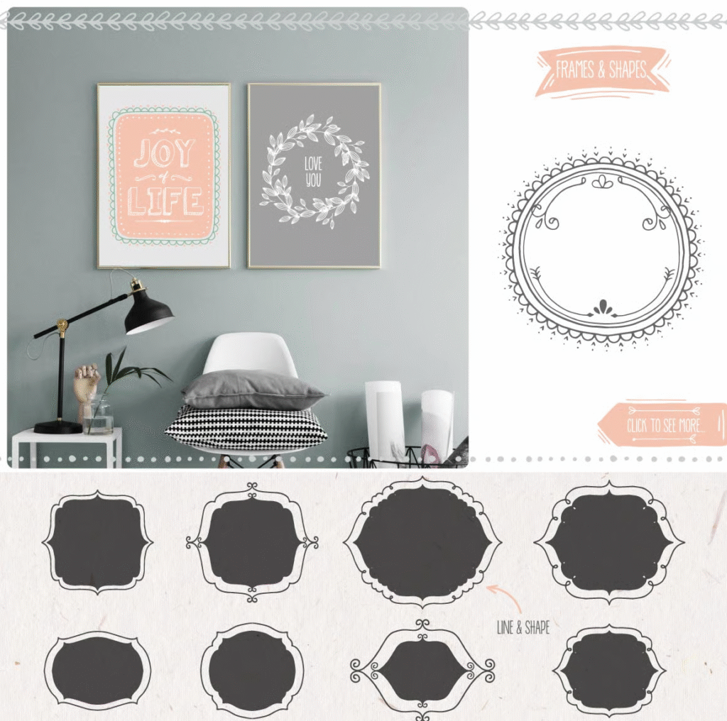 In this section, you can see the toolbox of decorative elements including logos, frames, and borders for graphic design, which is available for download in EPS, AI, PNG, and JPG formats. This set includes graphic or vector elements with various patterns and designs, including arrows, borders, and frames, for use in graphic design or image editing. With your personal taste, you can create special and beautiful designs for products, postcards, greeting cards, photo frames, etc. .