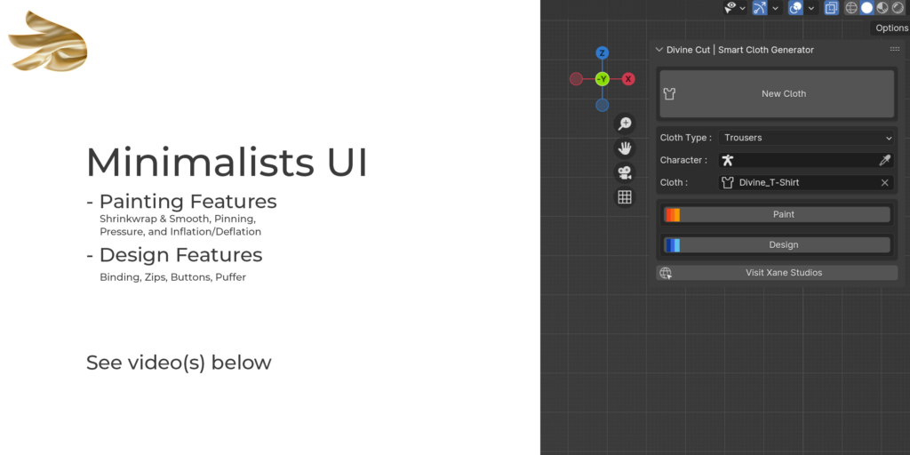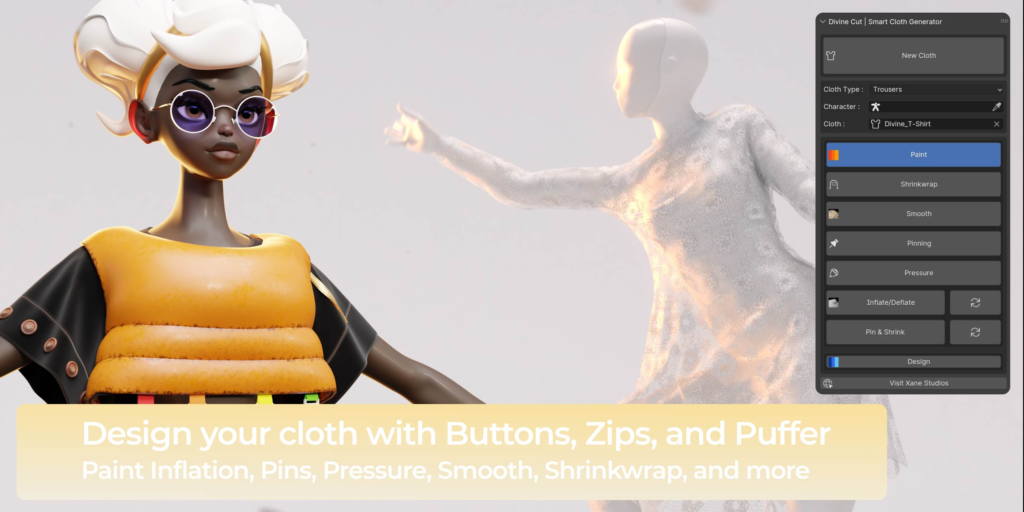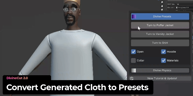 DivineCut™ is a Blender tool that helps you create clothes for your character(s) with a few simple clicks. It comes with a simple cloth generation feature, along with a number of user-friendly yet powerful tools to quickly get you from a simple cloth to complex in minutes.