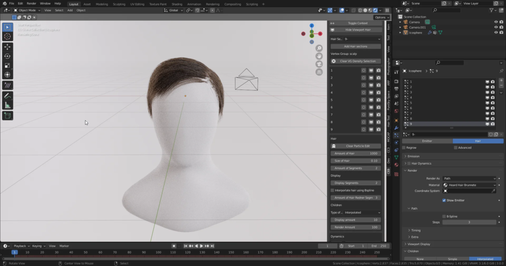 - Vertex Group Masking: Paint masks directly on the scalp to control where hair grows, its length, density, or stiffness, allowing for precise balding patterns or styled cuts.