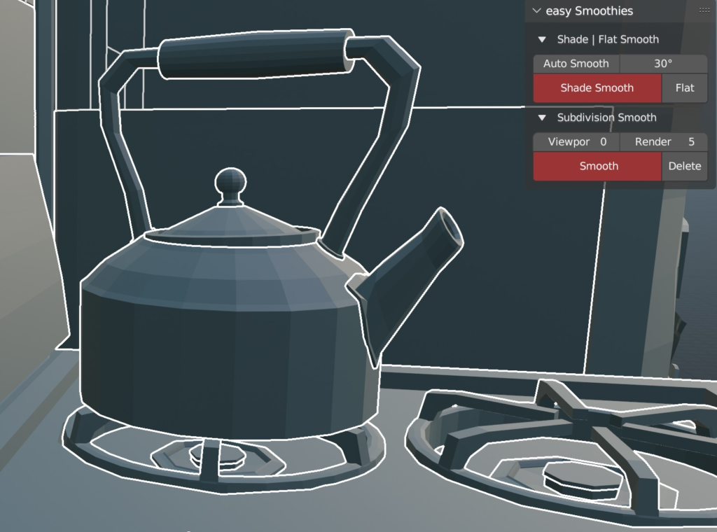 1 – Apply Shade Smooth on selected objects (“A” shortcut to select all objects if needeed).