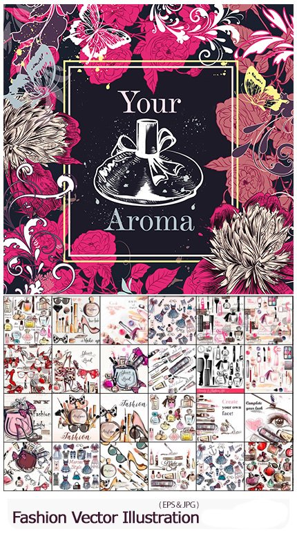 This section includes 25 graphic designs with the theme of cosmetics and perfumes in vector format, which are available for download in EPS and JPG formats on the site.