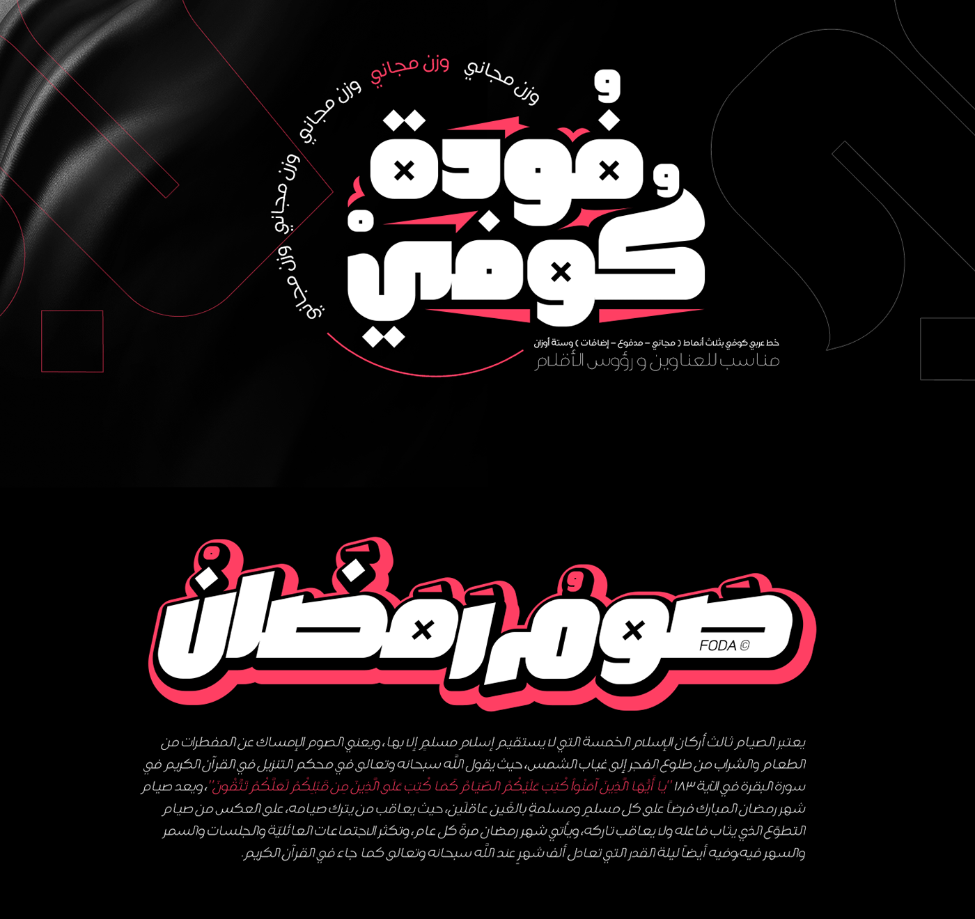 Fouda Kofi is a thoughtfully crafted Arabic Kufic typeface family that bridges tradition and modernity. With its roots in classical Kufic calligraphy—one of the oldest forms of Arabic script—this font brings historical authenticity to contemporary design while offering exceptional versatility through its multiple weights and decorative options.