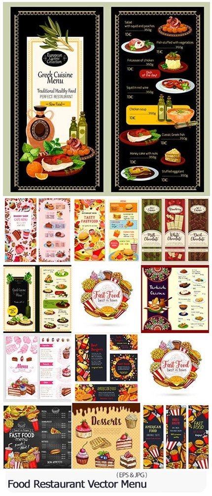 Food Restaurant Vector Menu 19 Vector Restaurant Menu Pictures, Fast Food, Sweets, Chocolate | 189 MB | Comes with preview | EPS & JPG format