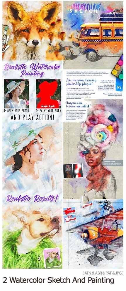 In this collection, you will see 2 Photoshop actions of making professional watercolor paintings, which have been placed on the site for download in ATN, PAT, ABR and JPG formats.