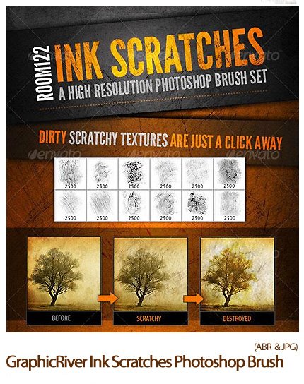 This Photoshop Brush set includes 12 high resolution ink scratches and scrapes. These brushes are perfect for overlaying on top of a design to add a touch of grunginess.