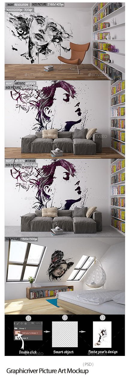 Graphicriver Picture Art Mockup psd Preview template to create artistic images on the wall from River Graphics 499 MB | PSD format