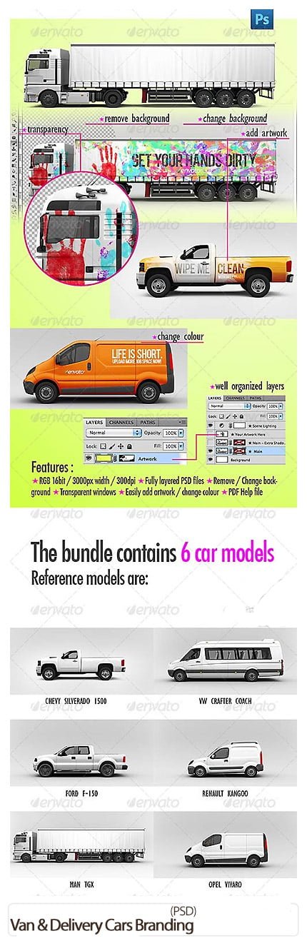 6 layered PSD van, delivery cars, pick up, truck and mini bus branding mock-ups – check preview for model references