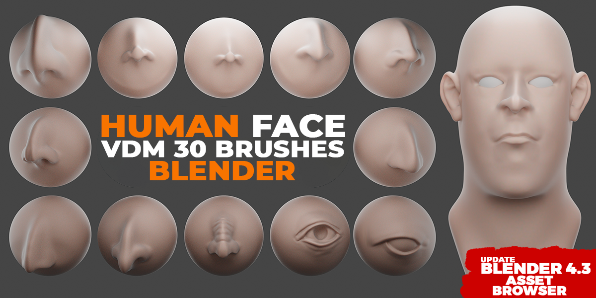 Download Human Face VDM Brushes v1.1 for Blender on Windows, Mac, and Linux, a comprehensive collection of Vector Displacement Map (VDM) brushes specifically designed for sculpting realistic human faces. This professional brush library provides everything you need to sculpt eyes, noses, mouths, ears, and facial features with incredible detail and speed .