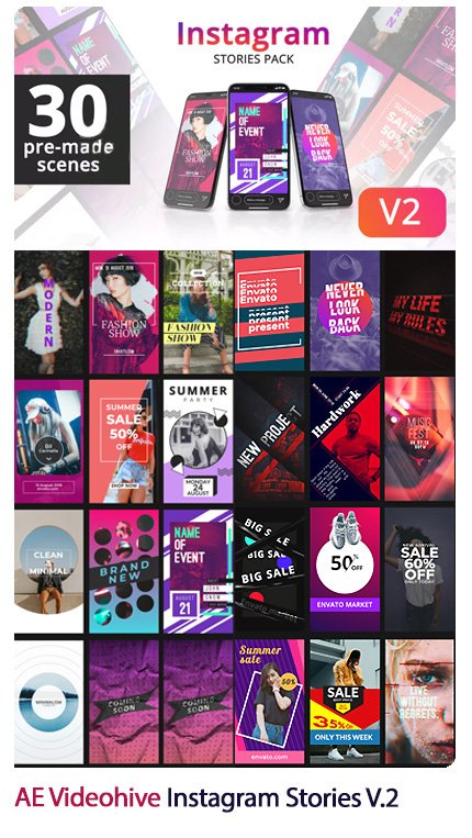 This collection includes ready-made Instagram stories for After Effects, along with a video tutorial along with a video , which is available on the site in AEP, MP4 and GIF formats.