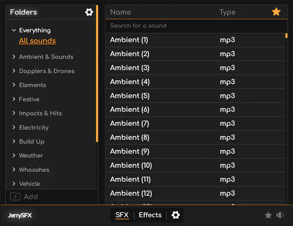 Personal Sound Library: Add your own custom sound effects to JerrySFX and organize them into personalized folders, allowing you to expand the library to fit your unique needs.
