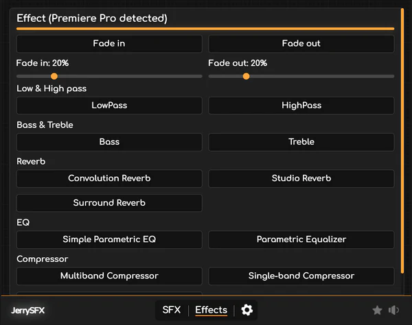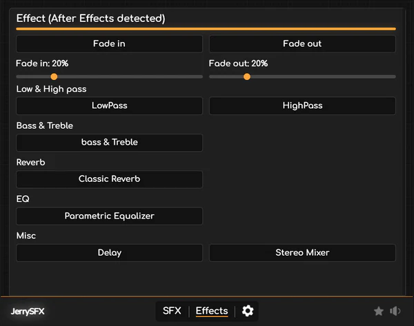 In the Effects Tab for After Effects, JerrySFX allows you to instantly apply Adobe’s built-in sound effects to your selected audio with just a click. This streamlines the audio editing process by giving you direct access to essential sound adjustments without leaving the JerrySFX interface.