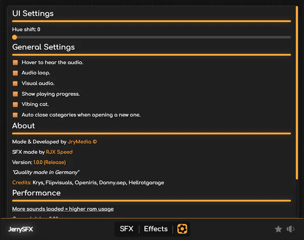 In addition, you’ll find a Performance Tab, where you can monitor the system’s performance as you work, ensuring that JerrySFX runs smoothly. Classic features from JerryFlow V2, such as color scheme personalization, are also available, letting you adapt the interface to your aesthetic preferences — and much more!