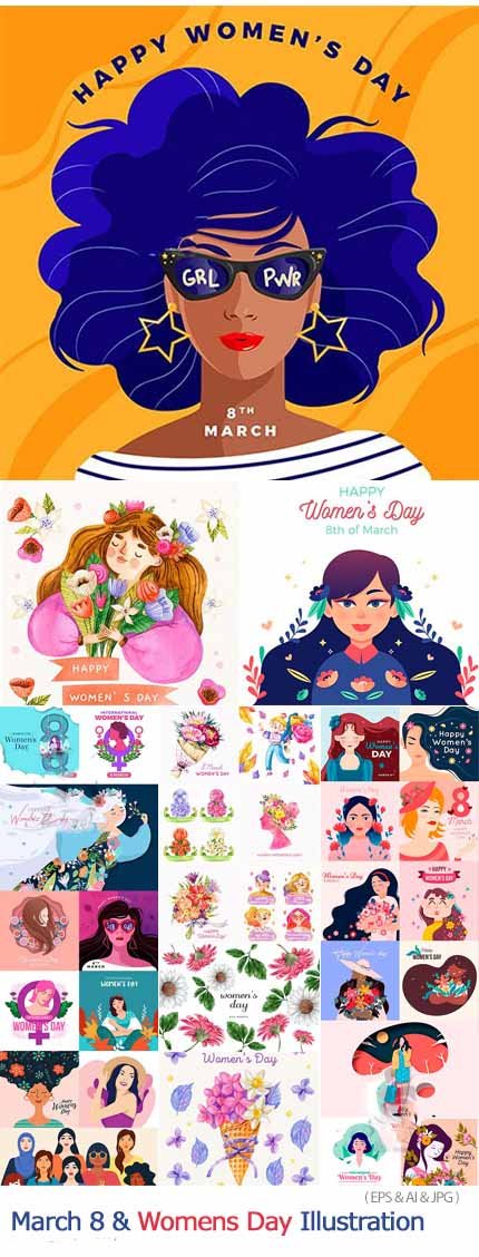 In this section, you will see 33 vectors of various graphic designs for International Women’s Day on March 8, which are available for download in EPS, AI, and JPG formats. You can use these fancy designs to create postcards and artwork related to Women’s and Girls’ Day.