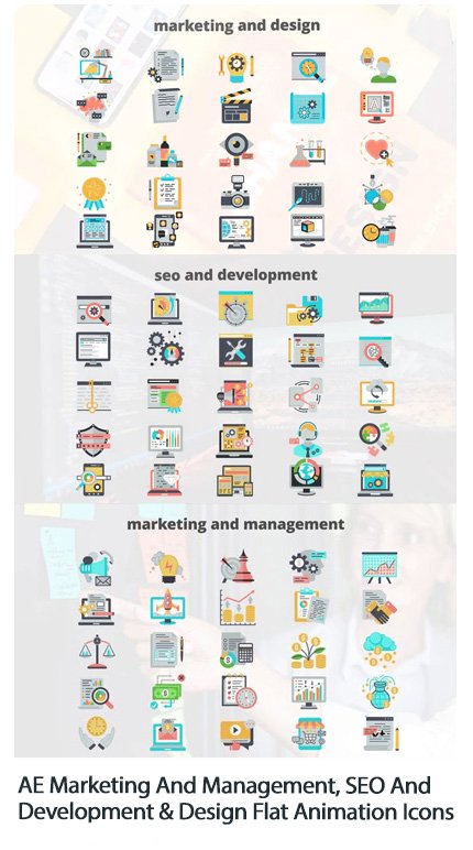 In this collection, you will see animated icons of marketing, SEO development and management system for motion graphics in After Effects of Motion , which are available for download in AEP and MP4 formats on the site.