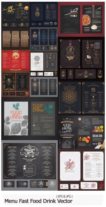 This section includes 25 vectors of restaurant, fast food and coffee shop menus, which are available for download in EPS and JPG formats.