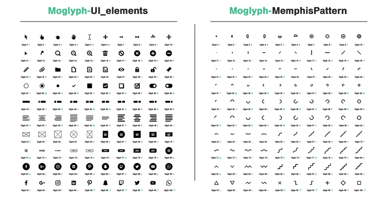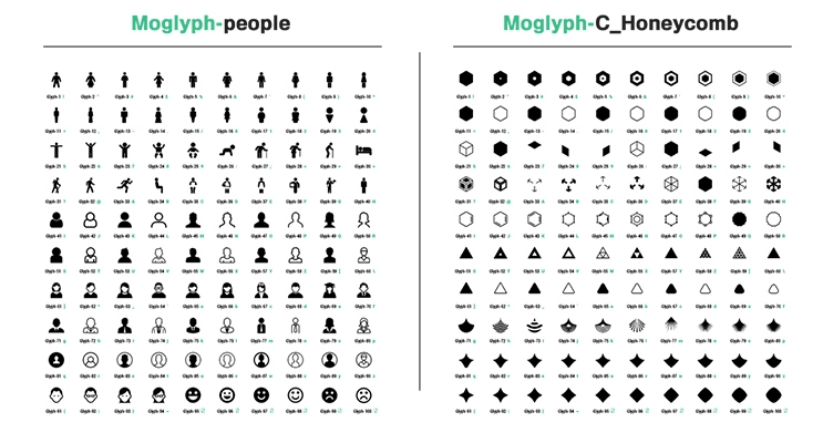 There are already 25 different MoGlyph thematic fonts, covering various usages like Geometric shapes, HUDs, Web UI, Infographics, patterns and even Particles (each of these fonts contains exactly 100 glyphs, meaning that you have a huge library of 2500 shapes to play with, and there will be even more added in future releases!).