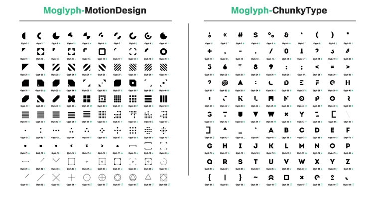 - Use the thematic Moglyph fonts (containing a huge library of more than 2500 Glyphs shapes!) in Illustrator’s glyph panel (perfect for the design and storyboarding process). And since they are System fonts, feel free to use them in any other software as well (Cavalry, Cinema4D… you name it 🙂